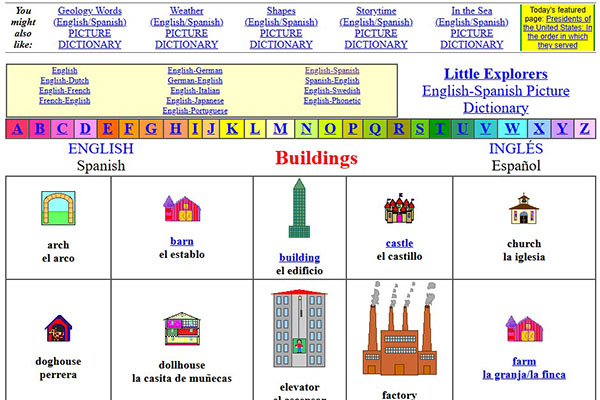 Learners can listen to the pronunciation and see the spelling easily with simple pictures. Site only offers English.